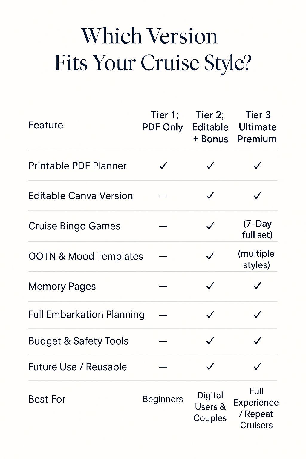 Every traveler plans differently — and your Cruise Travel Kit™ is available in three versions so you can choose the level that fits your planning style, cruise experience, and how supported you want to feel.